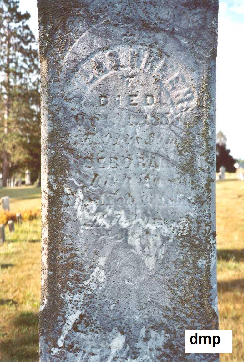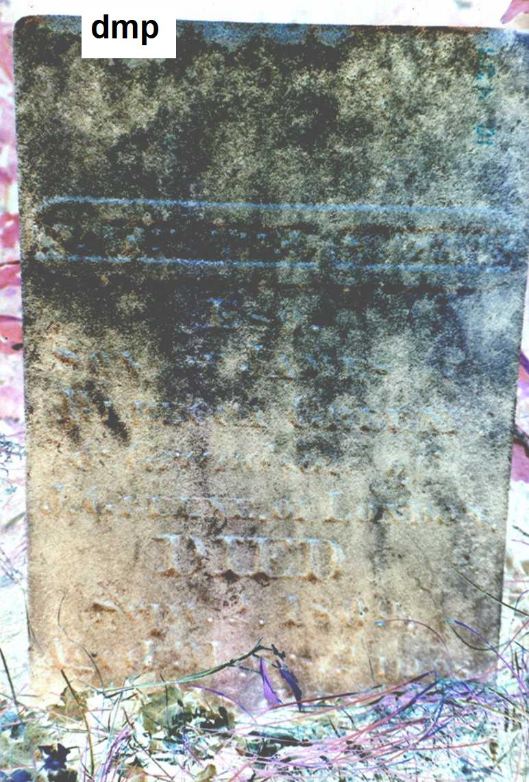 This is the negative image of the above picture with letters of the gravestone slightly more legible. The gravestone states: