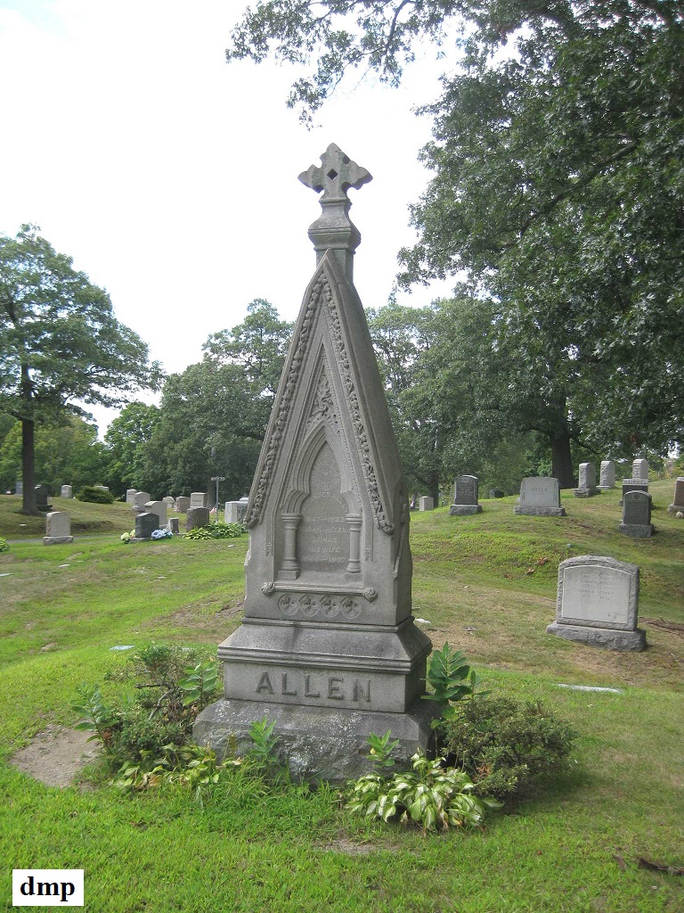 Grave of Philander Allen and Sarah Hellena (Lomas) Allen in Brookdale Cemetery in Dedham, Massachusetts.