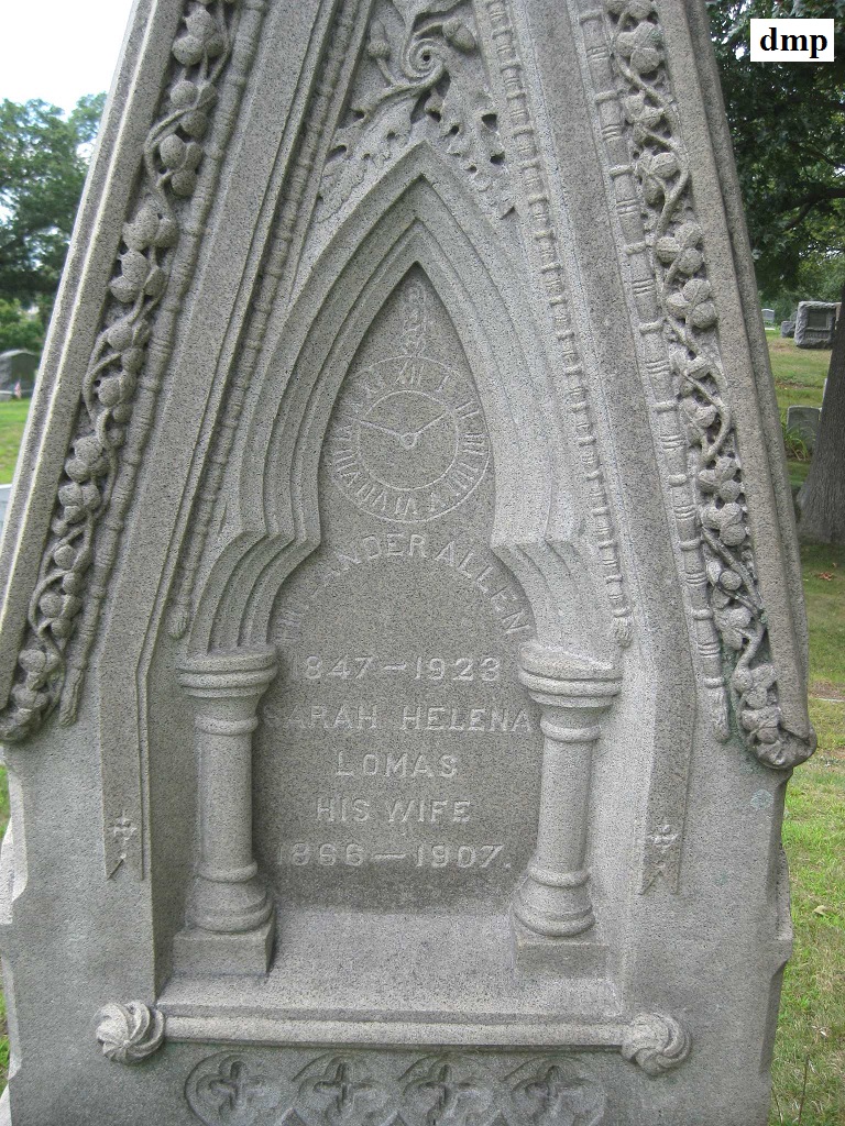 Close-up view of gravestone of Philander Allen and Sarah H. (Lomas) Allen.