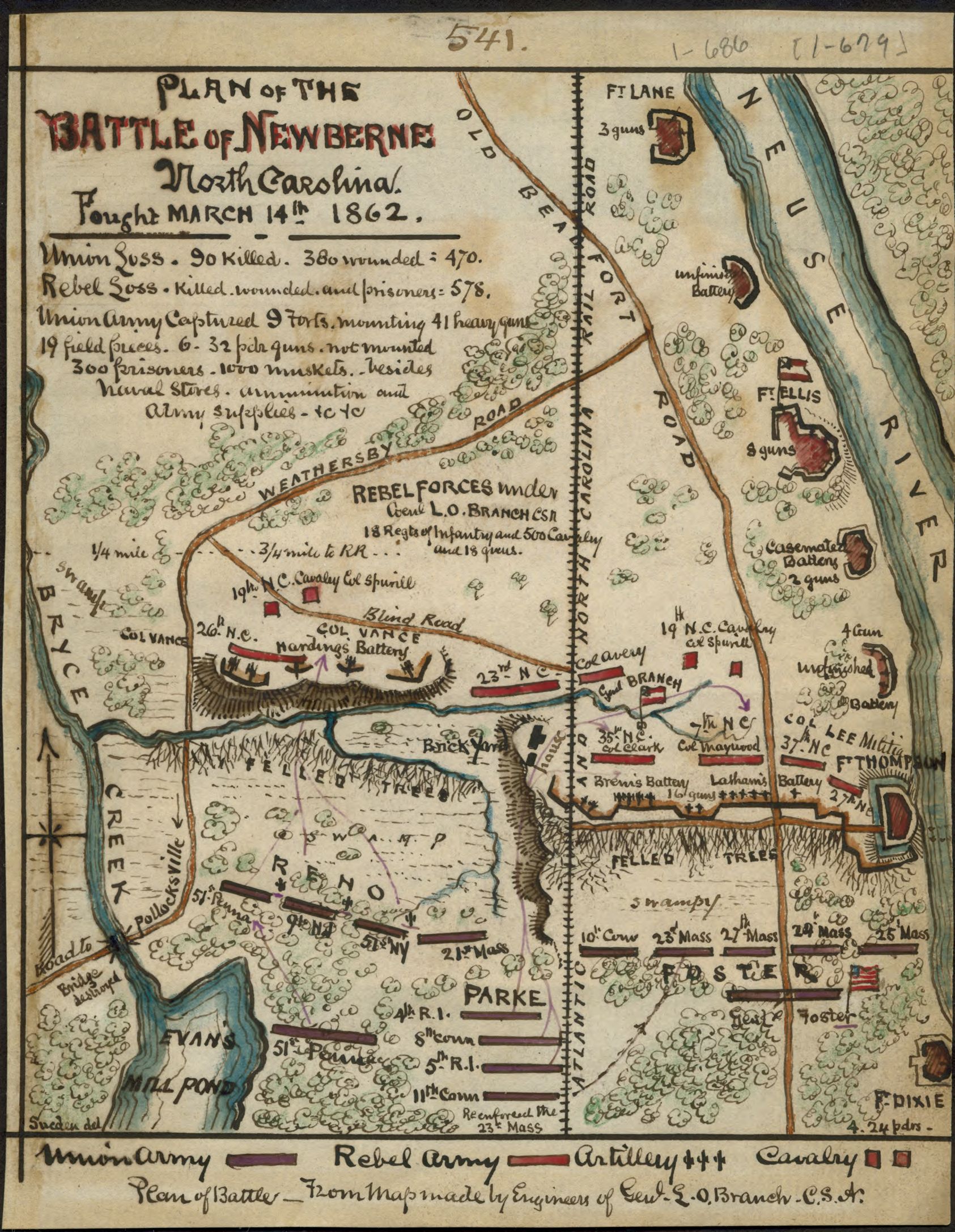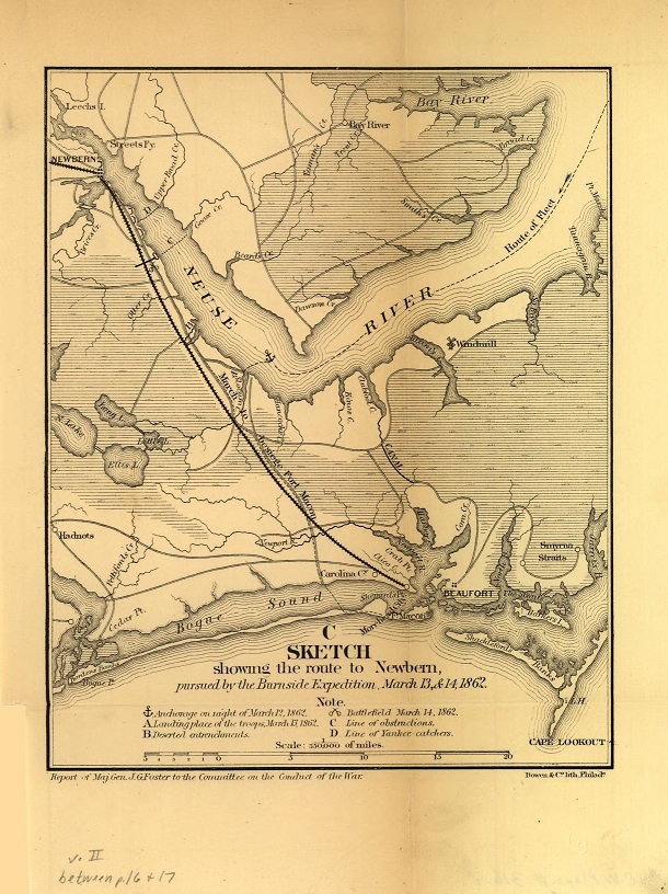 Map of Union Fleet's approach towards New Bern, N.C. up the Neuse River and debarkation point at Slocum Creek courtesy of U.S. Library of Congress.