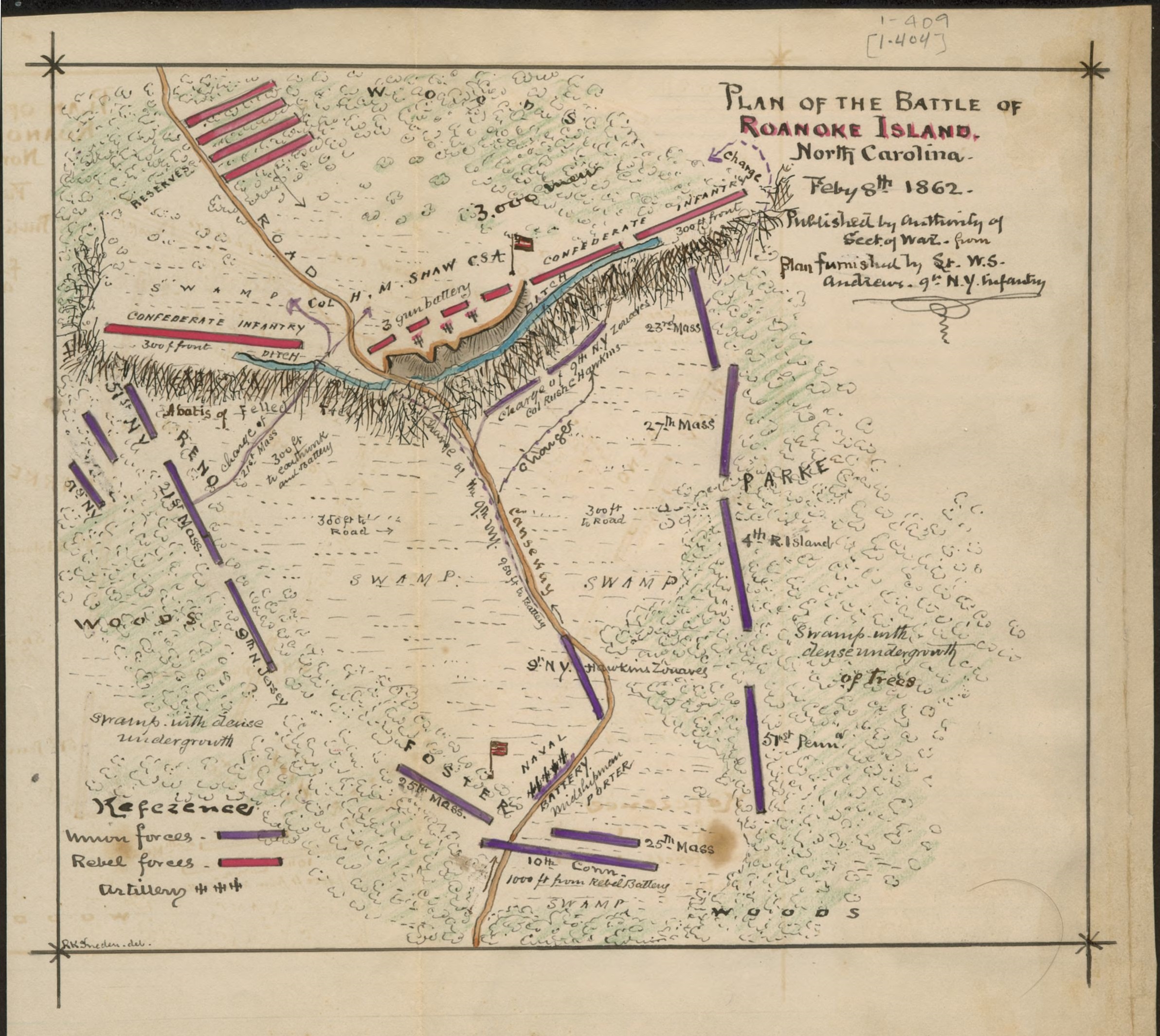 Map of Union landing on Roanoke Island from Ashby Harbor including the Fourth Rhode Island Regiment courtesy of U.S. Library of Congress.