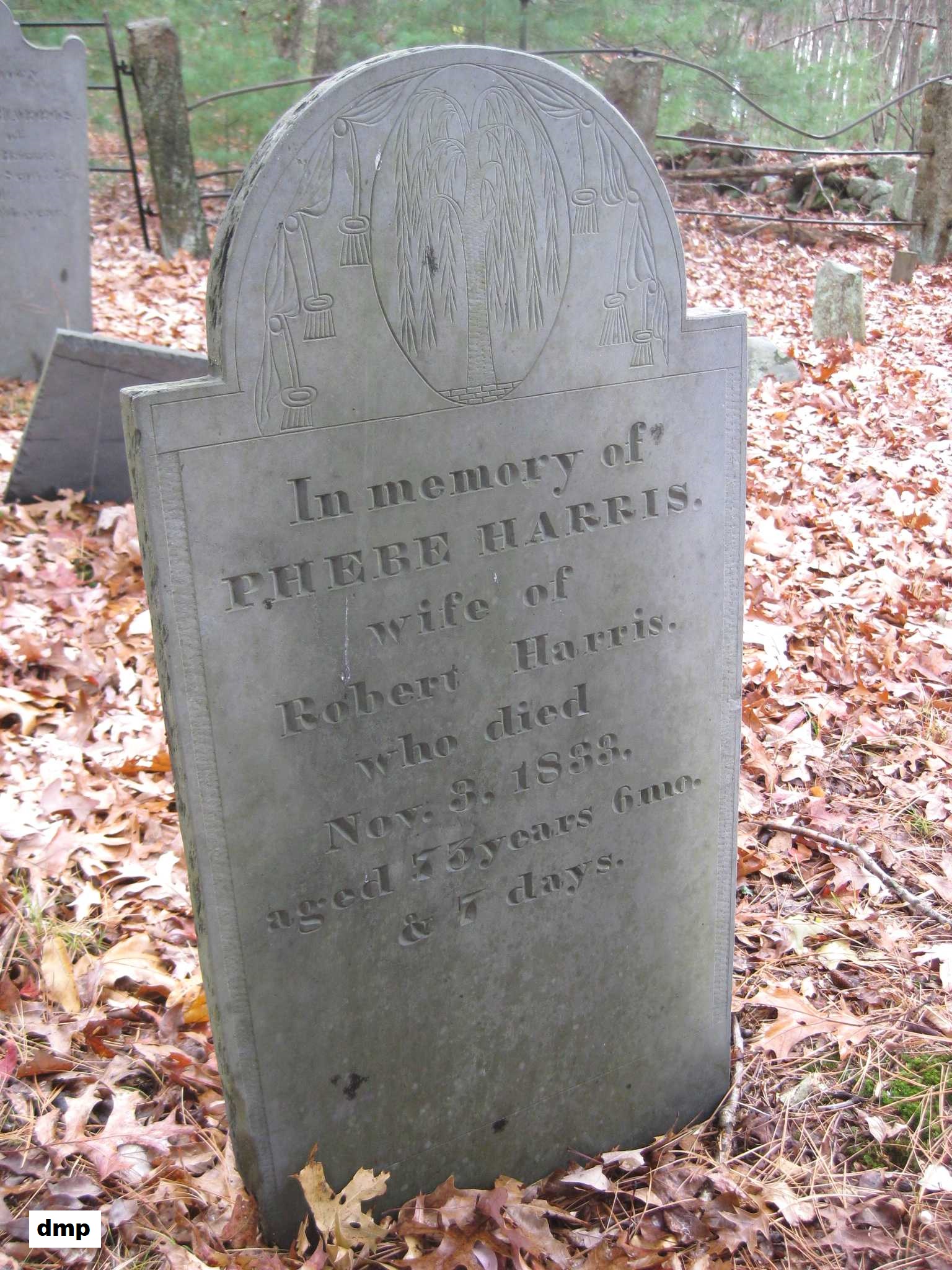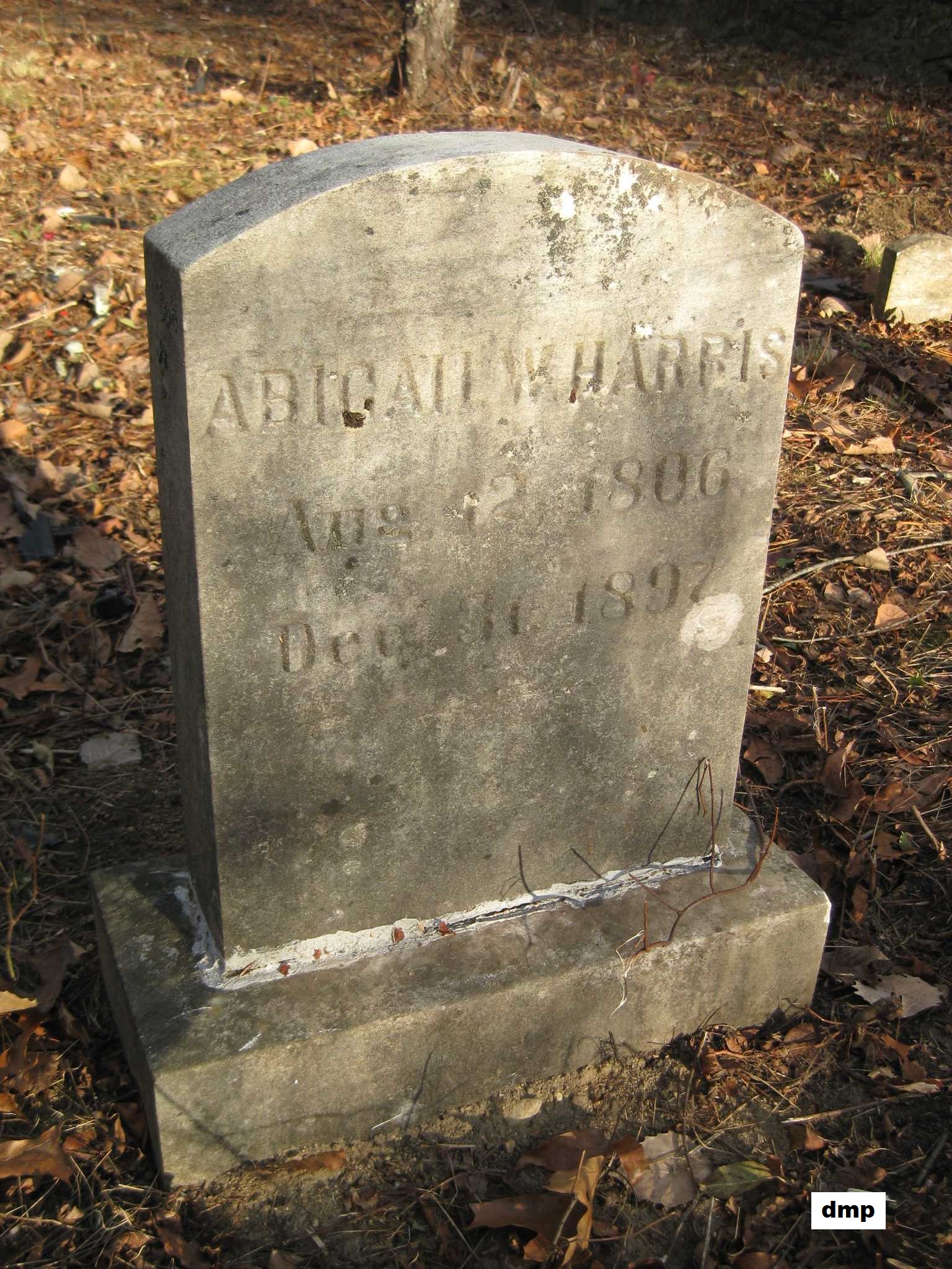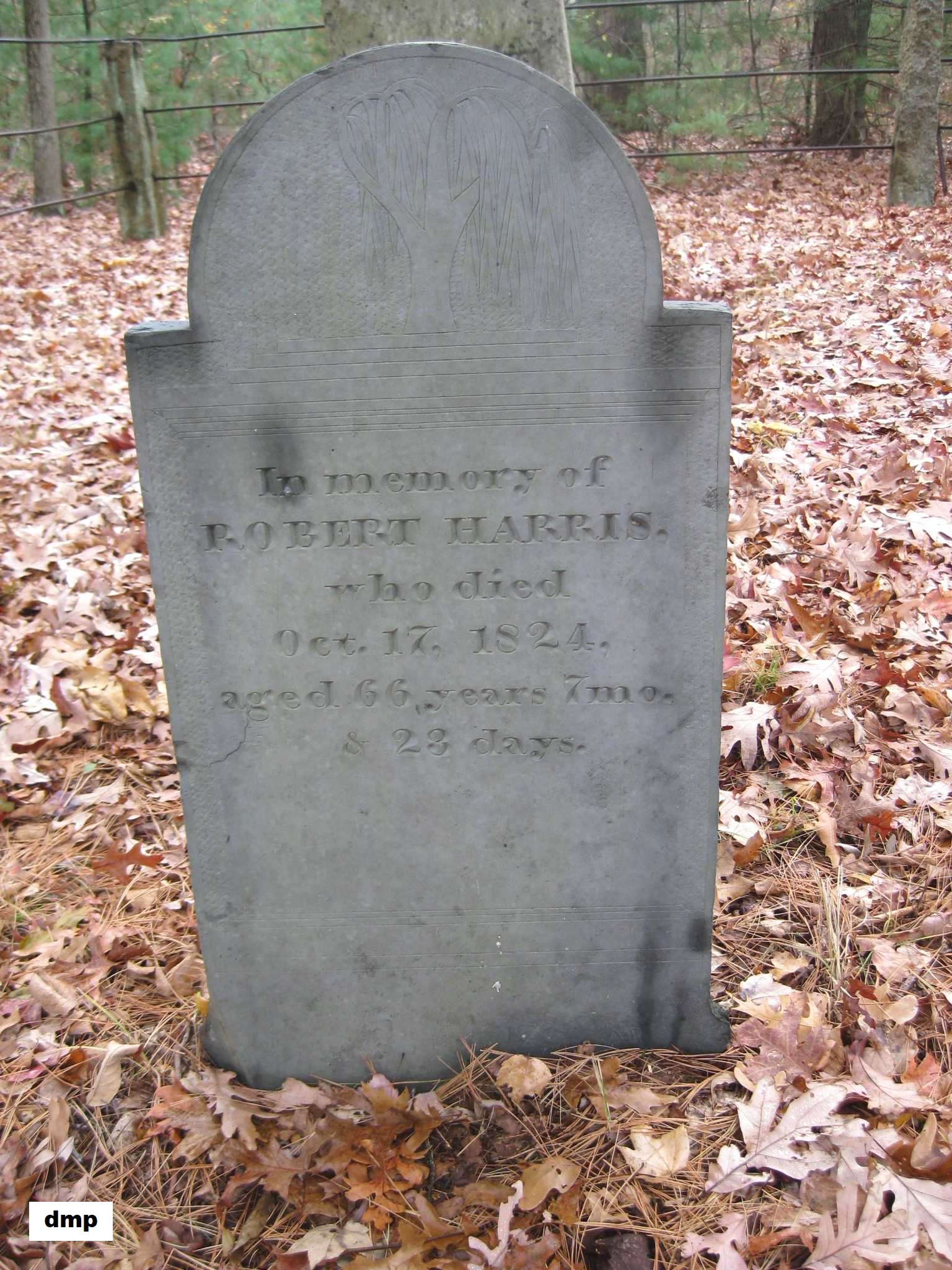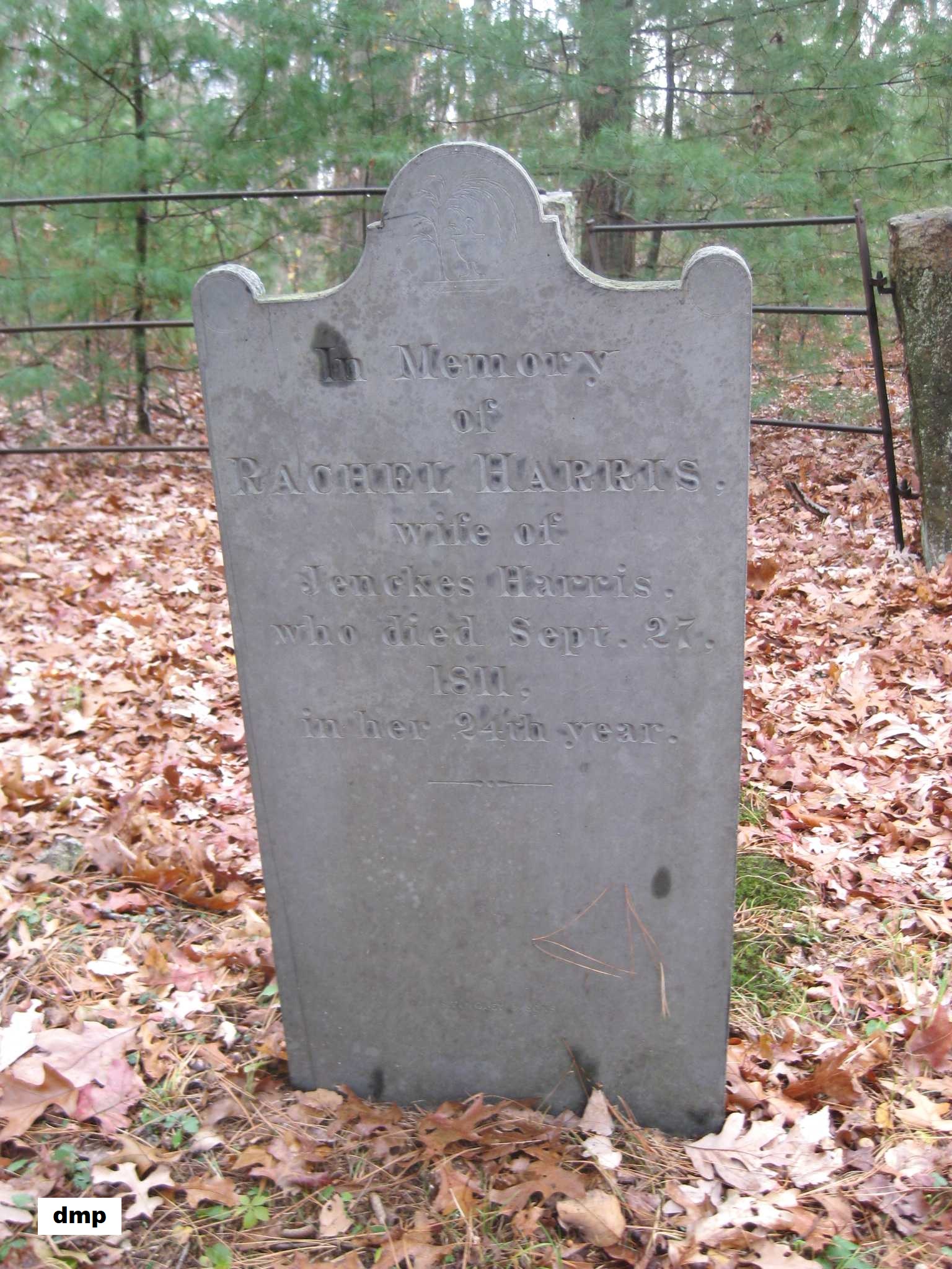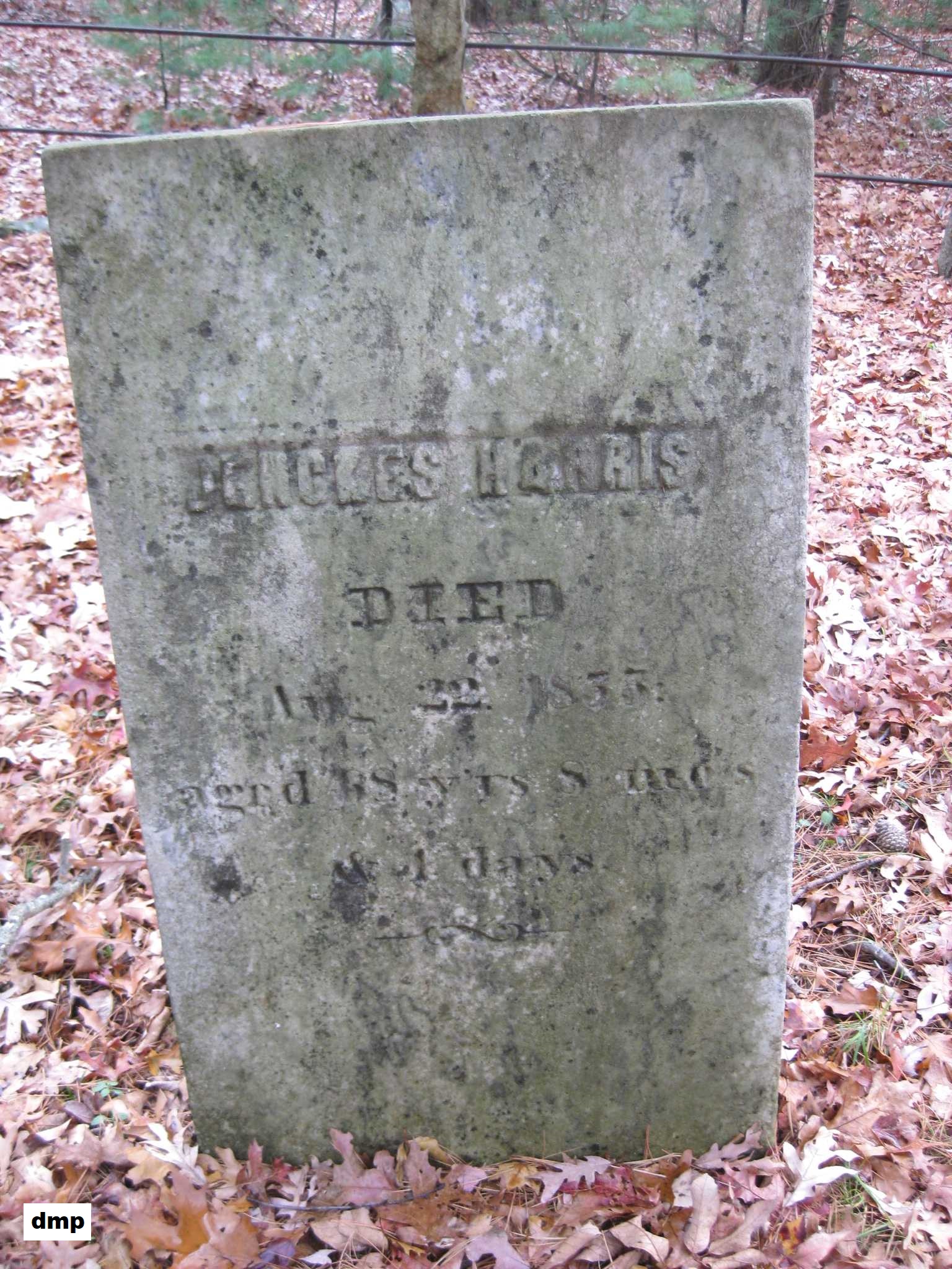 grave of Jenckes Harris Jr. Note the death date on the stone is incorrect; it should be July 15, 1869.