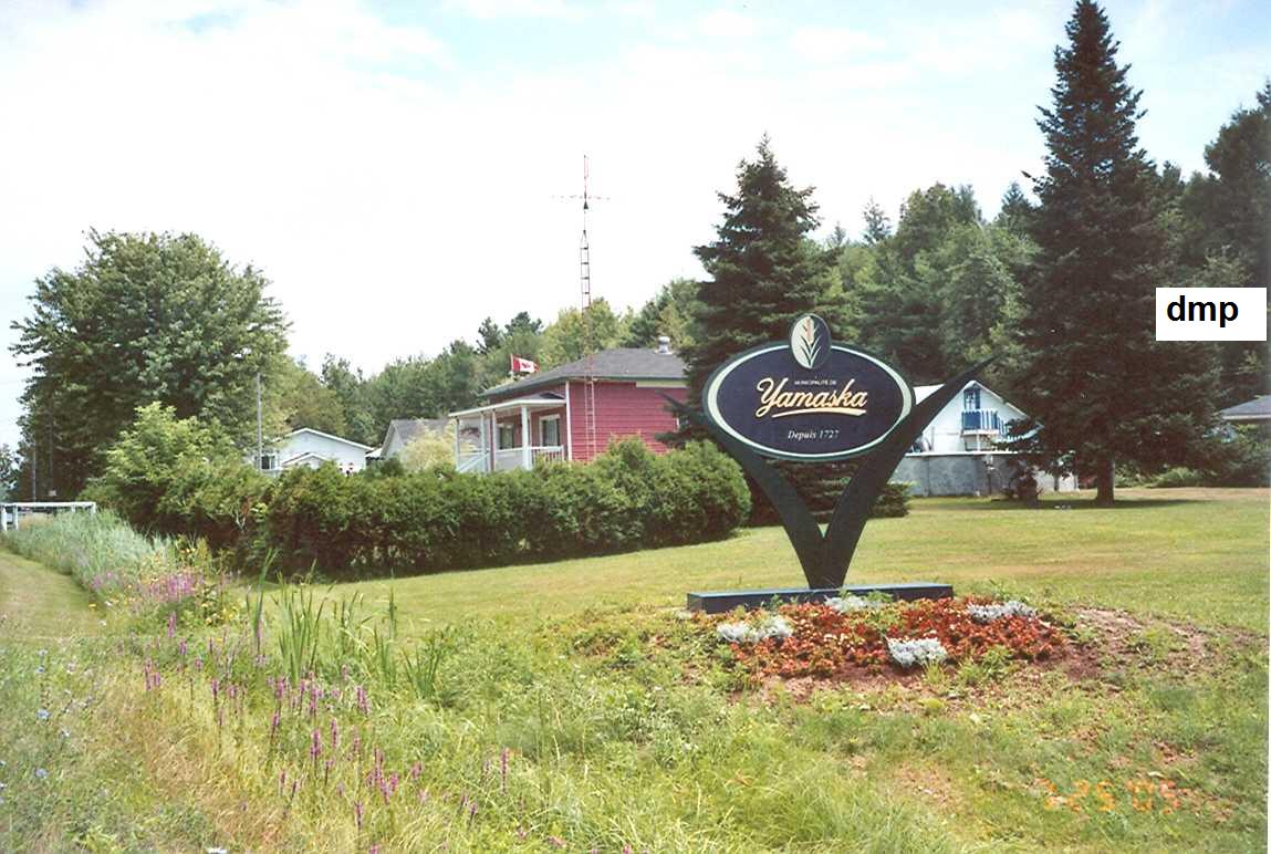 View of the town sign for Yamaska Town near the St. Lawrence River.