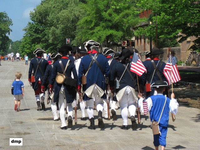 Members of the Military Interpretations Group of Colonial Williamsburg march down