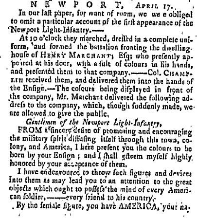 Joshua discovered this article about the flag of the Newport Light Infantry Company in Rhode Island