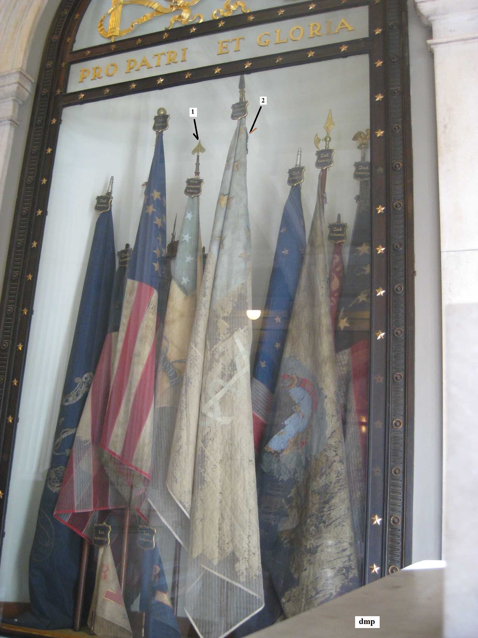September 28, 2011 view of the original Revolutionary War Flags (marked 1 and 2) in the Rhode Island State House.