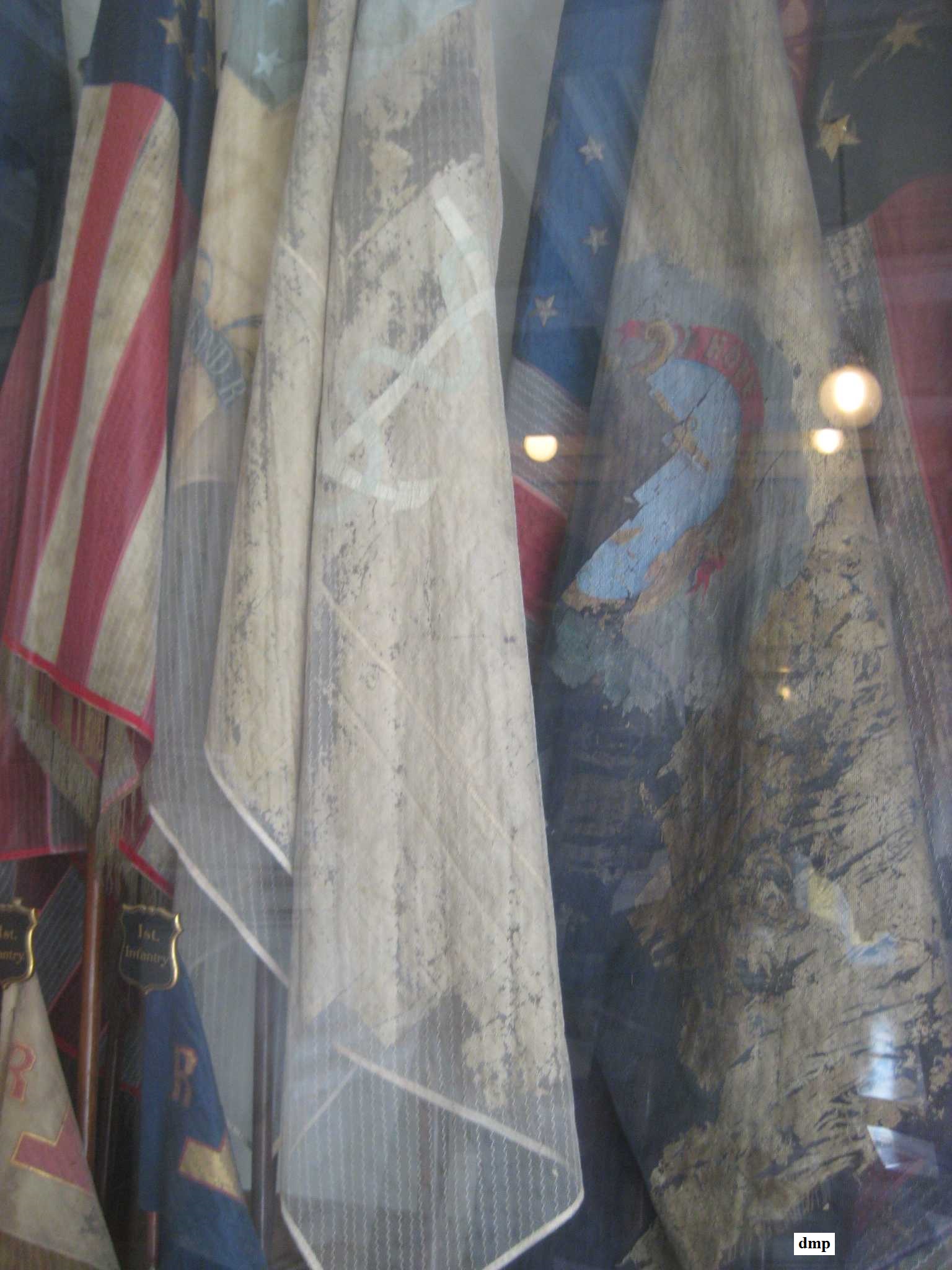 Close up view of the original Revolutionary War Flags in the Rhode Island State House. The original silk fragments